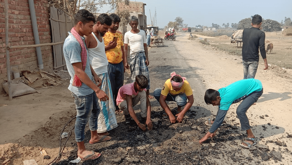 রাস্তা তৈরি হওয়ার এক দিনের মাথাতেই পিচ উড়তে শুরু করেছে