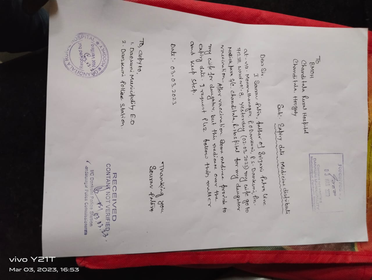 Thank you for reading this post, don't forget to subscribe!More than 30 children were vaccinated in ward number 10 of Dankuni municipality yesterday. Even though the date of the tablet that was given to the children so that they do not get a fever is over, the medicine was given to the children to eat. After seeing this, one Saurabh Patra went to the Dankuni police station to file a complaint and the police station advised him to contact the municipality instead of taking a complaint. A complaint has been lodged in contact with the municipal corporation. When deaths of children have been reported from different parts of the state for quite some time due to viral diseases, why was everything not investigated while giving medicines to children?