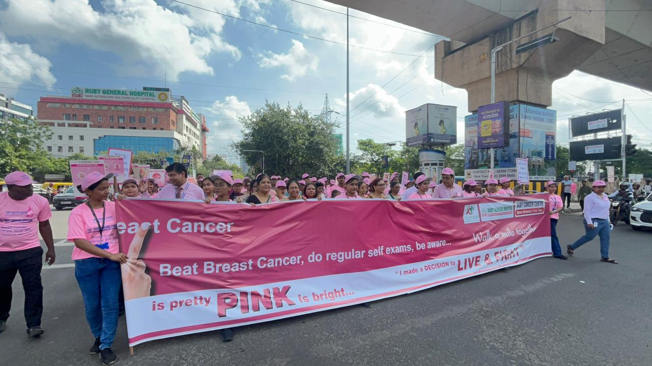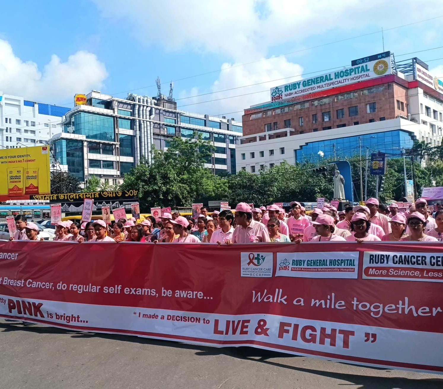 Since, awareness is the best tool to fight this disease, Ruby Cancer Centre, a unit of Ruby General Hospital, in association with Ruby General Hospital and Ruby Cancer Care & Research Foundation, had organized a picturesque awareness rally from Ruby General Hospital on Friday, 31st October, 2025 from 9 am, to generate awareness among the common people of Kolkata, West Bengal, about the importance of early detection of breast cancer. More than 350 participants had attended the rally. The cancer survivors, who are the Real Celebrities and Ambassadors for spreading awareness about early detection and treatment of the disease, were felicitated by the celebrities of other fields and eminent personalities present at the Cancer Awareness Walk. Around 20 cancer survivors and their families had participated in the walk along with nurses, hospital staff, students of Ruby Nursing School and College, eminent Oncologists like Dr. Partha Mukhopadhyay, Dr. Somnath Sorcer, Dr. Oindrila Biswas, doctors of other specialties like Dr. Bhaswati Das, Dr. Tirtha Pratim Purkait, Dr. Rimita Dey, and others were also present. Many well-known personalities, like actors Phalguni Chatterjee, Sudeshna Roy, Chandan Sen, Vicky Nandi, Arindam Ganguly, Anindya Banerjee, Saikat Mitra, Satrajit Sen, Sayantani Guhathakurta, Anilava Chatterjee, sports personalities like Alvito D’Cunha, Mehtab Hossain, and many others, had also joined. A large number of people from all walks of life had also participated in generating awareness among the people.