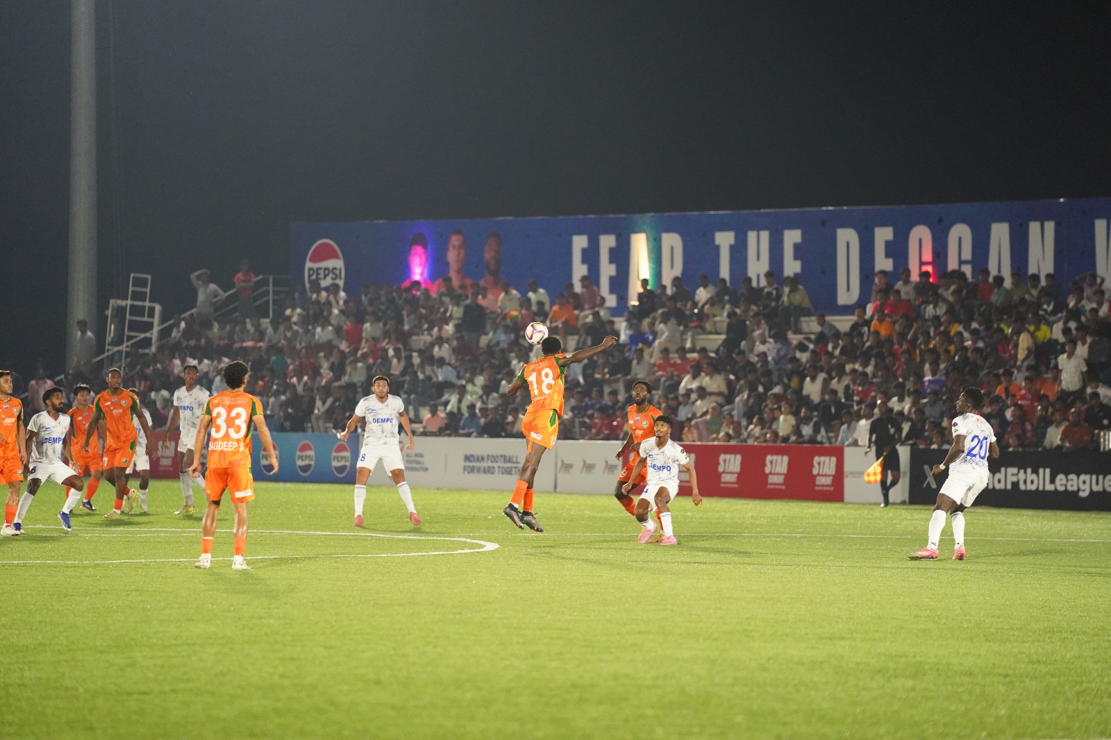 Hyderabad, Wednesday, March 25, 2026: Sreenidi Deccan FC produced a clinical display to defeat Dempo SC 3-1 in the Star Cement Indian Football League (IFL) 2025-26 at the Deccan Arena in Hyderabad on Wednesday, moving to the top of the table with 10 points from five matches, while Dempo SC remained at the bottom with two points. Carlos Vaz Pinto’s side took early control of the contest. A throw-in from the left by Jagdeep Singh caused a deflection in the box, and right winger R Lalbiakliana reacted quickest to fire in a left-footed effort from a tight angle to give Sreenidi the advantage. Sreenidi continued to press forward and created a series of chances, with Ashish Sibi producing key saves to deny David Castañeda, including a sharp stop from close range in the 20th minute and a diving effort to keep out his header moments later. From the resulting corner, Castañeda’s header struck the post. The pressure eventually told in the 29th minute when Deccan Warriors centre-back Hadi Idrissou doubled the lead. Winger Lalromawia delivered a precise cross from the right, and Idrissou rose to head home and make it 2-0.