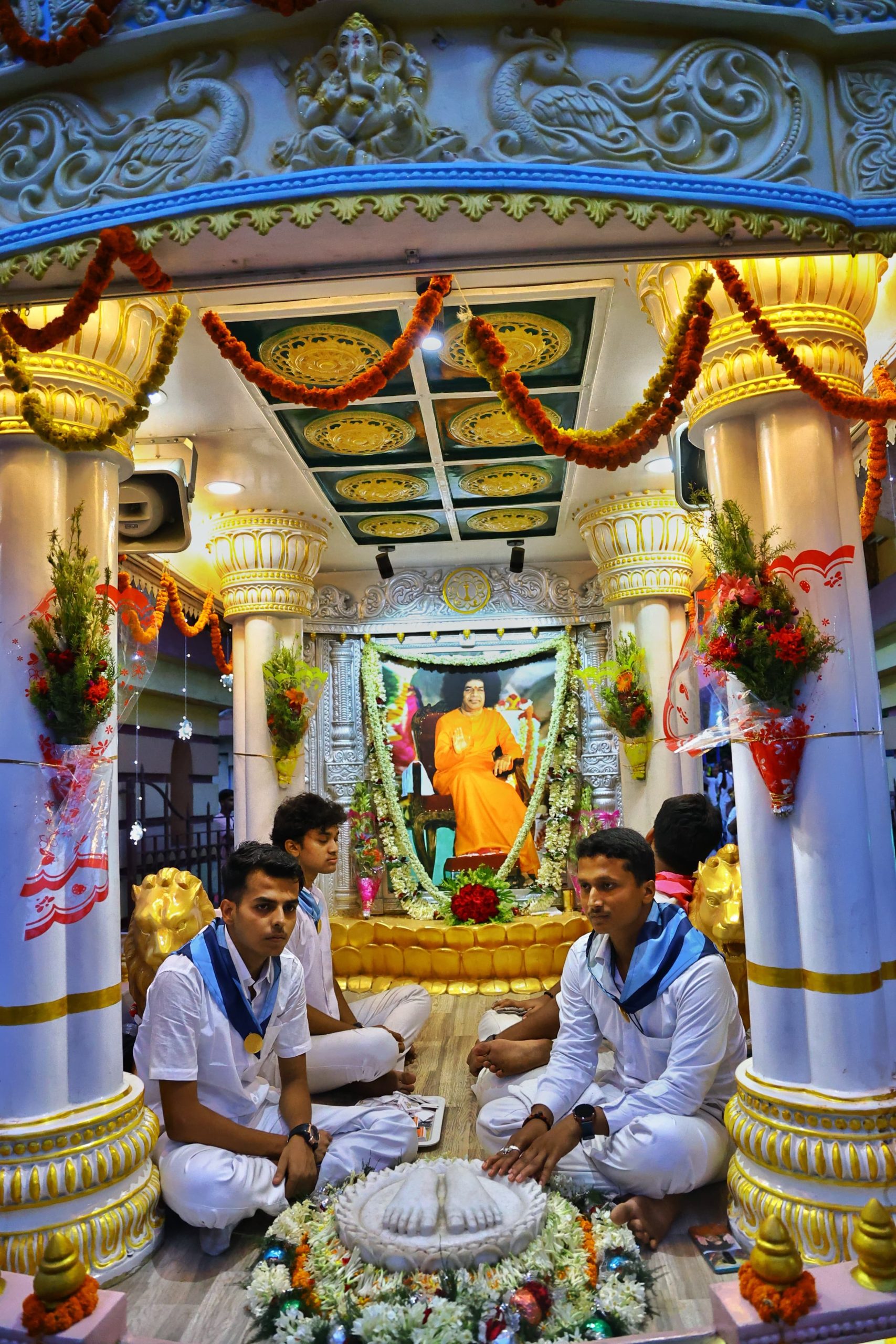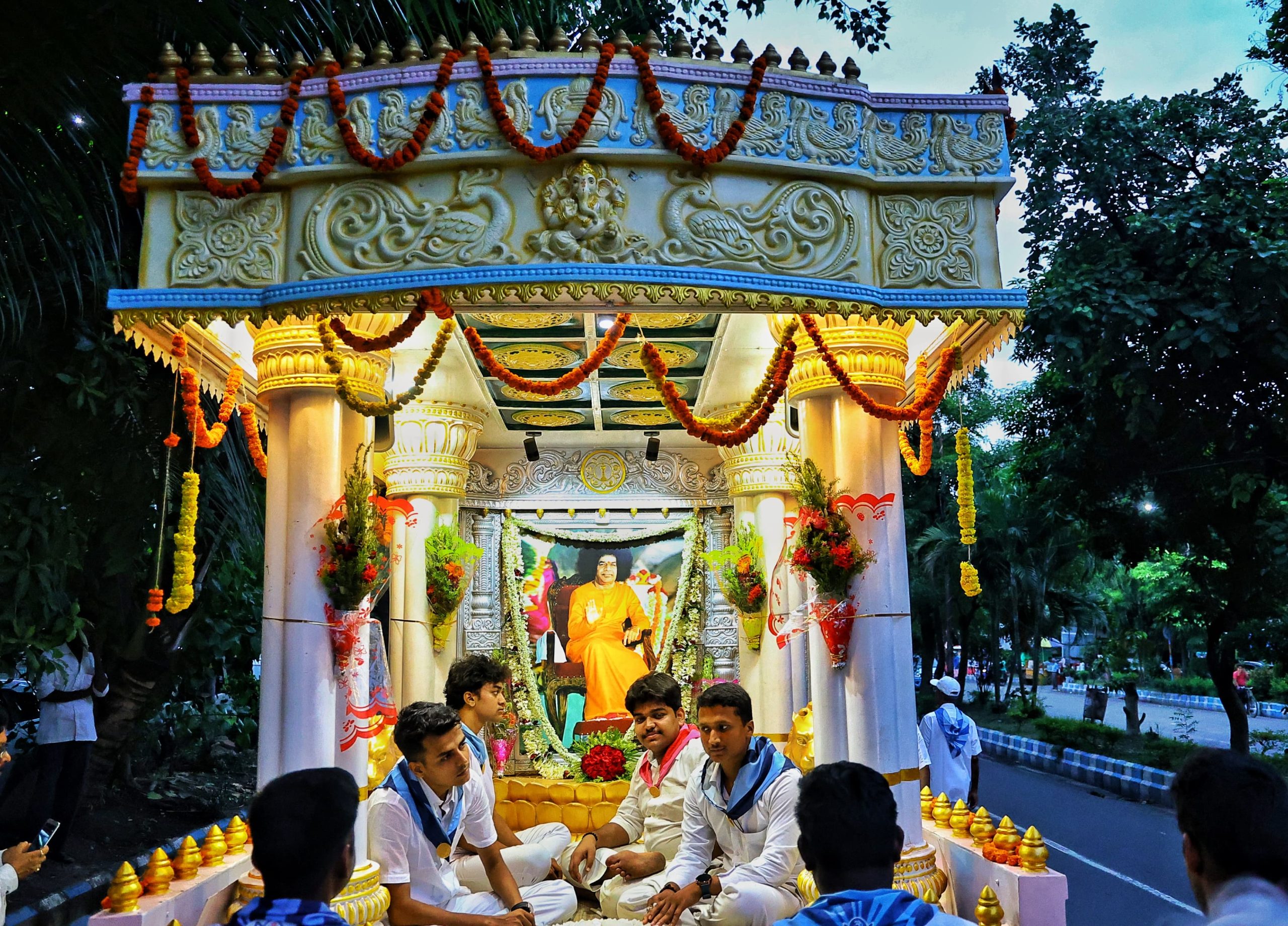 At the heart of each chariot is a beautifully designed altar, a replica of the Prasanthi Sannidhi, radiating the same serenity and sanctity as the holy Mandir. Resting at the feet of this divine shrine are marble padukas, lovingly placed so that devotees may offer their reverence, experiencing the grace of Bhagawan. For the countless devotees who long to visit Prasanthi Nilayam but are unable to make the journey, these chariots have become Prasanthi itself, coming home to them.